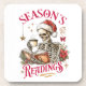 A festive and cheerful Christmas holiday design showcases a skeleton wearing a Santa hat, reading a book, and holding a steaming cup of coffee. Surrounding him are poinsettias, holly berries, and pine tree branches. The colorful text says: "Season's Readings." This design is available on a variety of products, making it the perfect gift for book lovers.