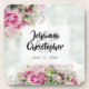 Ces jolis dessous de verre rendront votre réception vraiment spéciale. Ces dessous de verre font partie de notre collection de mariage aux roses roses. Ils présentent un magnifique design représentant un bouquet de roses roses sur un fond bleu pâle. Le texte est personnalisable pour que vous puissiez entrer les informations souhaitées.