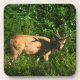 Photo d'une jeune rondelle, aux bois de velours, dans des buissons de feuilles vertes. Copyright ©2017 Kimberly J Tilley.