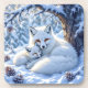 A sweet winter foxes themed coaster. A sweet illustration of two white foxes, a mama and baby cuddling under a tree in the snow.