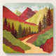 Un paysage abstrait avec des textures uniques montrant un paysage de montagne avec un sentier et des arbres randonnées et de beaux rayons de soleil dans les tons rouge, pourpre, jaune et vert.