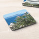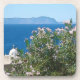 Aquarelle vue mer avec fleurs en fleurs, clocher blanc et vue mer et montagne dans une île grecque