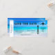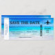 Une image tropicale au bord de la mer est l'arrière-plan de cette carte d'embarquement pour un mariage de destination Enregistrer la date.