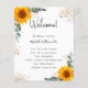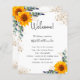 Un programme de mariage moderne, élégant, chronologie. Un arrière - plan blanc chic. Décoré de tournesols, de feuilles d'eucalyptus vert aquarellés, de sprigs, de verdure, de feuilles faux or et de taches de parties scintillant dorée. Personnalisez et ajoutez vos noms et les détails du mariage. Lettres de couleur noire. Si vous avez plus de texte, il est possible de réduire l'espace de ligne.