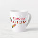 Personalized small latte mug features the Belgian flag in a rose motif. The flower has the black, yellow, and red colors of the tricolor. The stem reads BELGIUM, also in the tricolor. Now you can have your own Belgian Rose. Design across the entire mug. Makes a lovely gift for a housewarming party.