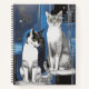 Journal dans une illustration de deux chats assis gracieusement contre un arrière - plan bleu profond et abstrait. Les textures réalistes en fourrure avec des lignes audacieuses et des éléments géométriques, créent une atmosphère moderne et surréaliste. Leurs yeux jaunes expressifs contrastent avec les tons cool.