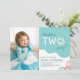 Cette mignonne invitation turquoise fête d'anniversaire est conçue pour une fille qui a 2 ans. Le texte moderne dit "(Nom) est DEUX sucré" accentué avec et givré beignets et offre une photo verticale. Photographie © Storytree Studios, Stanford, CA