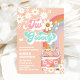 Célébrez la journée spéciale de vos petits avec cette invitation d'anniversaire rétro "Two Groovy" qui présente un fond pêche, des marguerites joyeuses, un arc-en-ciel pastel, des papillons et une camionnette flower-power. Parfaite pour une fête d'anniversaire pour un enfant de 2 ans, ce design ludique capture l'esprit de paix, d'amour et de plaisir. Avec des polices fantaisistes et des couleurs vives, il donne le ton pour une célébration joyeuse. Personnalisez facilement avec les détails de votre fête et créez un souvenir que vos invités adoreront.