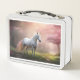 De belles photos de deux licornes différentes, sont présentées de chaque côté de cette lunchbox métallique. La Lunchbox est blanche, avec un côté montrant une jolie licorne debout dans les fleurs. L'autre côté a une photo d'une licorne dans un verre. En faisant une grande boîte à lunch métallique pour l'école, surtout pour les fans de licorne!
