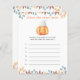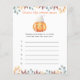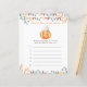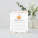 "Un petit citrouille est en route. Célébrez avec ce citrouille de dessins animés sur le thème du baby shower ! Aquarelle caricature kawaii citrouille avec casquette d'automne (casquette) et feuilles d'automne. Au verso de la carte se trouvent les feuilles d'automne.