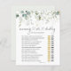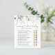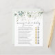 Ce design présente un jeu de Baby shower "Guess Who - Maman ou Papa" en Aquarelle avec des feuilles eucalyptus. Sur le dessus de la carte - confettis vert et doré effet. Le texte "maman ou papa" est écrit en caractères de script avec coeur joint.