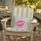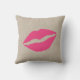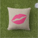 Les lèvres audacieuses, lumineuses, roses sur un arrière - plan de toile illustré de toile de jute accentuent ce coussin extérieur mignon, lui faisant un accent doux sur le porche, la plate-forme, patio ou par la piscine.