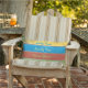 Ce mignon coussin extérieur a un look de panneau de plage en bois coloré avec des frondes de palmiers dans les coins et, "Salty Hair Sandy Toes Ocean Breeze Anything Goes" écrit sur elle dans une police ludique, en faisant une grande maison de plage, pool house, pont, patio ou accessoire au bord de la piscine. Il est facile de personnaliser avec votre propre dicton si vous préférez.