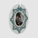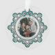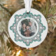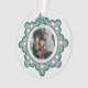 Celebrate the season with this elegant holiday keepsake ornament featuring a classic black diamond pattern accented with turquoise details and charming coquette bows that beautifully frame your family photo. The back includes space for an additional photo, along with room for a personal message and family names.