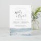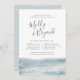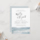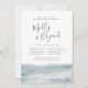 Nos élégantes invitations à des dîners de répétitions mariages d'été présentent un style nautique classique avec un look épuré et minimaliste. Design propose un lavage à l'aquarelle le long du fond en bleu gris pâle, avec les détails de votre cérémonie de répétition et de dîner dans un mélange chic de bloc, italique et de typographie manuscrite. Parfait pour les dîners de répétition d'été ou nautiques. Les invitations se retournent vers des bandes ondulées dessinées à la main en ton sur ton bleu-vert glacé.