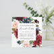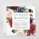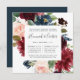 Notre invitation à dîner fleurie radiante dans un format carré unique encadre votre répétition de cérémonie mariage et les détails du dîner avec des fleurs d'aquarelle peintes en rose rousse, marsala bordeaux et bleu marine, avec feuillage d'eucalyptus vert.
