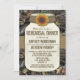 Dîner de répétition Mason Jar Camo Invitations - avec un arrière - plan de camo imprimé suivi d'un pot de mason qui a le dessus enveloppé en ficelle (design imprimé) avec un tournesol placé au centre. Une bande de burlap imprimée entoure l'avant et l'arrière. L'arrière de chaque invitation rustique ou champêtre présente le même design de faire-part de mariage de camo que celui que l'avant partage. Cette conception peut être mise à niveau vers différentes options de stock de carte trouvées ci-dessus.