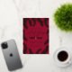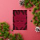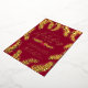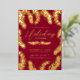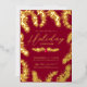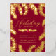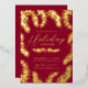 Branches de sapin et petites baies rouges dessinées à la main avec une bordure dorée, invitation pour dîner de vacances. Idéal pour les dîners de vacances. Fond rouge vin profond avec bordure de pin en or et petites baies rouges dessinées, design graphique. Art et conception de Sarah Trett pour www.mylittleeden.com