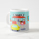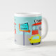 Servez quelque chose de spécial avec ce Diner Jumbo Mug des années 1950. Le dessin animé est composé d'un bâtiment en brique rouge avec des fenêtres bleues, de portes doubles grises et d'un panneau blanc qui dit "Diner" perché sur le toit. Dans le parking, un deuxième panneau est sur un poteau. Le panneau a un arrière - plan turquoise et une flèche rouge clignotante pointant vers "Don's Diner". Le panneau a fait son travail parce qu'il y a une voiture jaune vif avec des nageoires garées à côté. Même si nous ne pouvons pas les voir, les passagers de la voiture doivent se casser les lèvres. Une jeune carhop mignonne fait du roller jusqu'à la voiture. Ses cheveux brunes sont dans une queue de cheval gonflée. Elle porte un petit uniforme rose avec une garniture noire et un tablier blanc. Équilibré d'une part, le carhop porte un plateau noir tenant un hamburger géant et une bouteille de soda rafraîchissante et désuète. L'arrière - plan derrière le diner est turquoise de nuages bleu clair et de silhouettes de cèdres.