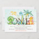 Dinosaur thème 1er anniversaire invitation avec trois dinosaures. Le dos de l'invitation a un motif tropical verdoyant.