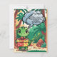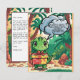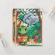 Un mignon bébé dinosaure présentant un cadeau à l'enfant d'anniversaire dans une jungle préhistorique. C'est une belle carte de voeux d'anniversaire pour les petits enfants qui sont dans des créatures fantastiques et des dinosaures.