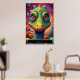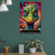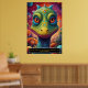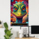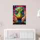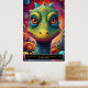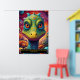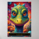 Dinosaure fantaisiste et vibrant qui semble être un mélange de charme fantastique et préhistorique. Le dinosaure a un long cou et une grosse tête, avec une expression aux yeux écarquillés et des yeux surdimensionnés captivants qui lui donnent un air mignon et curieux. Sa peau est ornée de motifs complexes ressemblant à des formes et des points colorés tourbillonnants, comme si son corps était peint avec un kaléidoscope de textures en bleu, vert, jaune et violet. Le fond vibrant, avec ses cieux tourbillonnants et ses planètes abstraites, donne l'impression d'un paysage extraterrestre, suggérant que le dinosaure réside dans un monde surréaliste et fantastique. Les couleurs vives et exagérées et les traits ludiques donnent au créature un caractère amical et animé, idéal pour un cadre magique ou onirique.