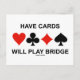 Faites faire aux autres une double prise avec une dose d'humour de pont du joueur de carte à puce avec cette carte postale avec les quatre costumes de carte ainsi que le dicton "Ayez des cartes joueront le pont". Pont mémorable disant carte postale pour n'importe quel joueur de pont passionné!
