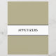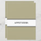 Page de séparation double face personnalisée pour un classeur de recette de coordination ; une conception d'un ensemble de correspondances. Dispose d'un design minimaliste moderne simple dans une palette de couleur verte moderne avec du texte personnalisable présenté sur une bannière blanche de coordination avec accents noirs Banner affiche du texte personnalisé avec le texte "APPETIZERS" en police simple. Vous pouvez customiser en changeant le texte à l'aide des champs fournis ou en utilisant le bouton "message" pour contacter le concepteur pour obtenir de l'aide. Pour créer votre propre séparateur de chapitre de recettes de livre de cuisine : 1. Sélectionnez personnaliser ce modèle. 2. Remplacez le texte. 3. Vérifiez votre conception pour le dimensionnement et le placement. Un simple séparateur de chapitre de livre de recettes pour compléter votre trousse de classeur de recettes de livre de recettes, pour organiser vos recettes ou vos plans de repas, ou un cadeau de cuisine moderne réfléchi pour le cuisinier, le chef ou l'organisateur de votre vie.