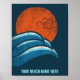 Créez votre propre affiche de voyage personnalisée pour décorer votre espace. Cette affiche est prête à être personnalisée avec le nom de votre plage locale, votre lieu de vacances préféré ou tout texte que vous choisissez et a un style de surf amusant rétro. Il présente une illustration de style rétro des vagues qui s'écrasent dans les tons bleus avec un soleil orange brillant au-dessus et des mouettes en silhouette contre le soleil. Le graphisme a un style déprimé qui lui donne un look usé et vintage. Et votre texte apparaît en coordonnant les lettres bleu clair.