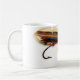Une tasse blanche simple avec le beau docteur saumoné de Helmsdale de mouche de pêche dans le détail renversant