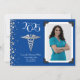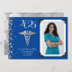 Célébrez le nouveau docteur en médecine diplômé de l'école de médecine avec ce faire-part de diplôme en argent et en bleu de la médecine. Elégant avec une bordure photo vintage et des accents de confettis argentés! Idéal pour toute personne diplômée en tant que médecin ou ayant un doctorat !
