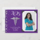 Célébrez le nouveau docteur en médecine diplômé de l'école de médecine avec ce faire-part de graduation en argent et en violet de médecine! Elégant avec une bordure photo vintage et des accents de confettis argentés! Idéal pour toute personne diplômée en tant que médecin ou ayant un doctorat !