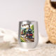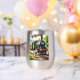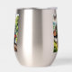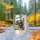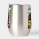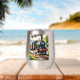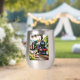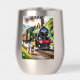 A nostalgic scene of a dog greeting the arrival of a green steam train.