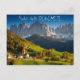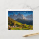 Carte postale avec le village St. Magdalena avec son église dans le Villnoesstal au Tyrol du Sud, Italie, pendant la saison d'automne avec les montagnes Geisler Dolomites dans l'arrière - plan avec le texte italien : 'Saluti dalle Dolomiti', 'Salutations des Dolomites'.