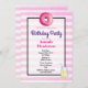 Un invitation fantaisiste et sucré de fête d'anniversaire. Un arrière - plan rayé rose et blanc. Le dessus est recouvert d'une couche semi-transparente avec une bordure noire. Un beignets vitré rose avec des arroses en haut et un verre de limonade rafraîchissante en bas. Personnalisez avec les détails de votre fête.