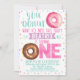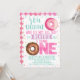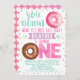 Donut Want To Miss This Party first Birthday Invitation Ce beigne de fille veut manquer cette invitation d'anniversaire de fête comprend deux beignets, des bannières et des éléments décoratifs sur un arrière - plan blanc. C'est une façon douce et branchée pour les invitations à votre petite fête d'anniversaire.