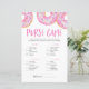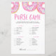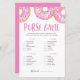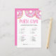 Recherchez les objets de la liste dans votre sac à main. La personne qui a le plus de points est le gagnant! | Ajoutez cette amusante carte de jeu "What in your purse" à votre baby shower. Cette carte de jeu trivia baby shower présente des beignets d'aquarelle rose avec des arrosages colorés. Personnalisez en ajoutant des noms, des événements et des dates. Ce jeu de sacs à main beignets roses est parfait pour toute saison de baby shower ou de thème.