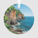 A Christmas ornament with an comic style illustration of Door County, Wisconsin. The pretty dune ledges and rustling blue water or Lake Michigan.