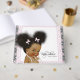 Livre d'or en baby shower rose et noir avec adorable petite fille afro-américaine portant de jolis arcs et perles roses sur un joli arrière - plan en dentelle rose et noire. Vous pouvez facilement customiser ce livre d'invité de baby shower bébé douce en ajoutant simplement le texte de votre choix.