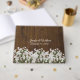 Livre d'hôtes rustique chic à thème mariage, réalisé dans un look de bois foncé, avec des graphiques de l'haleine de bébé blanc sur le fond avant. Personnalisez les champs de texte pour votre journée spéciale. Des produits mariages correspondants sont disponibles.