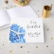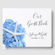 Livre d'hôtes mariage avec hydrangée bleue et étoiles de mer / étoiles de mer design. Faisant partie de la suite Seaside Garden, ce livre blanc a des polices de caractères manuscrites modernes pour le titre et les noms du couple. Incluez également la date de l'événement dans le texte imprimé. Design propre et simple, mais élégant, pour un couple se marier près de la mer.