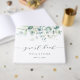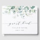 Ce livre d'hôtes mariage présente des eucalyptus à l'aquarelle peinte, des feuilles verts botaniques et bleus clairs avec une calligraphie moderne.