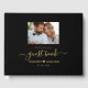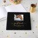 Elégant Simple Gold Script Mariage Black Guest Book Personnalisé. Livre d'hôtes mariage en noir et or. Caractéristiques du texte moderne "livre d'invité" à la main lettré de la queue de swash police calligraphie, date mariage et couple prénom avec motif/forme coeur d'amour. Customisez avec votre photo préférée et personnalisez vos informations. Il est idéal pour un jour mariage ou anniversaire.