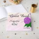 Jolies fleurs violettes avec un éclat de violet violet crème d'aquarelle. Personnalisez avec les prénoms de la mariée et du marié et le mariage de date sur la couverture. Le livre d'or est écrit sur le devant du livre, et l'amour est écrit sur le dos du livre en écriture noire. Notre histoire d'amour est écrite sur le côté. Oeuvre originale Design par TamiraZDesigns.