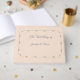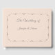 Le design avant présente un arrière - plan rose champagne à votre texte affiché dans une police argentée élégante. Exemple de texte : "Le mariage de" suivi des noms de mariée et mariée sur la ligne suivante. Des textes et des images sont affichés dans une belle et délicate bordure argentée. Le centre arrière est décoré avec le symbole d'une croix d'argent avec des anneaux mariages, les initiales de la mariée et du marié élégamment positionné de chaque côté. Très formel et élégant. Conçu pour coordonner avec la "Suite Mariage purement catholique". Également disponible en blanc.