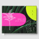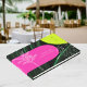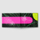 Arcs roses et jaunes néon sur l'arrière - plan de feuilles de palmier foncé avec monogramme, nom et date, ainsi que des illustrations de traits en ligne de feuilles de palmier blanc.