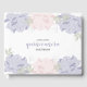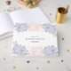 Livre d'or élégant et mignon qui est la façon parfaite de garder des souvenirs spéciaux pour la fille d'anniversaire de tous ceux qui ont assisté à sa Quinceanera. Le design se compose de pivoines roses et violettes avec des feuilles verts et gris. Le texte à l'avant et la colonne vertébrale sont modifiables pour correspondre aux détails spéciaux de la date d'anniversaire de la fille.