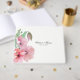 Joli livre d'hôtes de mariage blanc avec aquarelle des illustrations de pavots roses. Personnalisez le texte noir pour votre journée spéciale.