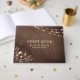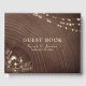 Élégant livre d'hôtes de style rustique avec arrière - plan en faux bois, lumières à cordes brillantes et oeuvres d'art florales en or. Personnalisé avec les noms et la date du couple, parfait pour accueillir vos invités dans le style.