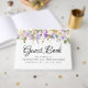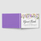 Les roses violettes roses et blanches d'ivoire se combinent à de nombreux feuilles et pendants pour créer une belle bordure florale le long du sommet de ce livre d'or mariage. Le livre d'hôtes est écrit dans un grand script courant. Les noms du couple mariage, l'emplacement du mariage et la date suivent dans une police serif classique